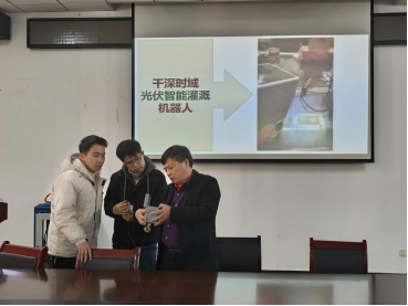 在讲座中,刘晓初教授以轴承技术的发展为切入点,系统分析了纳米改性材料在高质生产中的实际应用价值,并深入讲解了其技术特点和前沿进展。同时,他结合自身丰富的科研经历,详细分享了专利申请的关键技巧与学术论文的撰写方法,内容充实且极具实用性。随后,刘教授与两名员工共同演示了团队研发的干深时域光伏智能灌溉机器人的操作步骤。这一技术的展示生动诠释了高效绿色农业与智能制造的深度融合,令在场师生耳目一新。